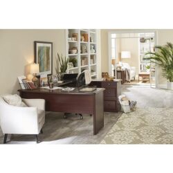 Give your corner office a style boost with this Realspace Broadstreet U-shaped desk. The 3 drawers provide storage for files and supplies, while the pullout keyboard tray allows for comfortable typing. A bridge connects the 2 spacious work surfaces, delivering abundant space for your computer, calendar and peripherals. This Realspace Broadstreet U-shaped desk boasts a flip-top hub for easy Ethernet, telephone and power access. Desktop boasts a laminate finish for durability. Slide-out keyboard drawer supports a comfortable typing position. 3 drawers provide flexible storage for paperwork and essentials. Assembly required. Finished in cherry. Tested to meet ANSI/BIFMA Perfomance Standards – Manufacturer testing has been conducted on this product to meet specific performance requirements and safety standards set forth by the American National Standards Institute (ANSI) and the Business and Institutional Furniture Manufacturers.
