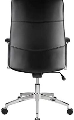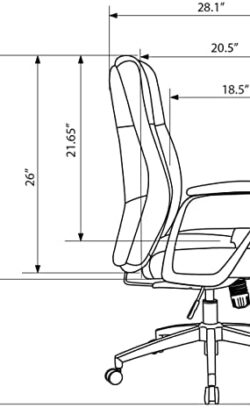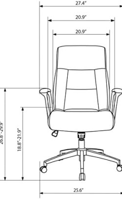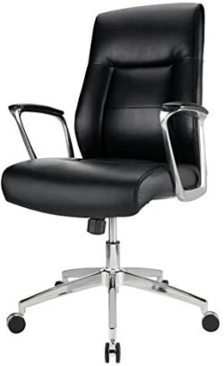 Upgrade your office setup with this Realspace Modern Comfort Delagio executive chair. The padded armrests and waterfall seat cushion offer optimal comfort, while the base rolls and swivels for easy mobility. A pneumatic adjustment feature lets you personalize the seat height. Featuring bonded leather, PVC and polyurethane materials, this Realspace Modern Comfort Delagio executive chair delivers a premium look and feel, and the tilt tension and lock maintain stable positioning. Recommended for performance use 6-8 hours per day. Weight capacity tested to support 275 lbs. Waterfall seat cushion helps improve circulation and enhance comfort. Meets and/or exceeds ANSI/BIFMA performance standards. Assembly required. Dimensions: 40-13/16″H x 28″W x 27-2/5″D. Black upholstery with silver base. Backed by the manufacturer’s 5-year limited warranty.